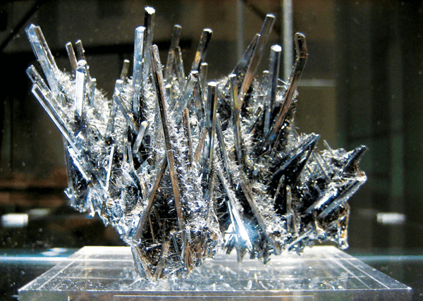 Antimony is primarily found in the sulfide mineral stibnite (Sb₂S₃). Deposits are formed via hydrothermal processes, often in association with lead, silver, and gold ores.